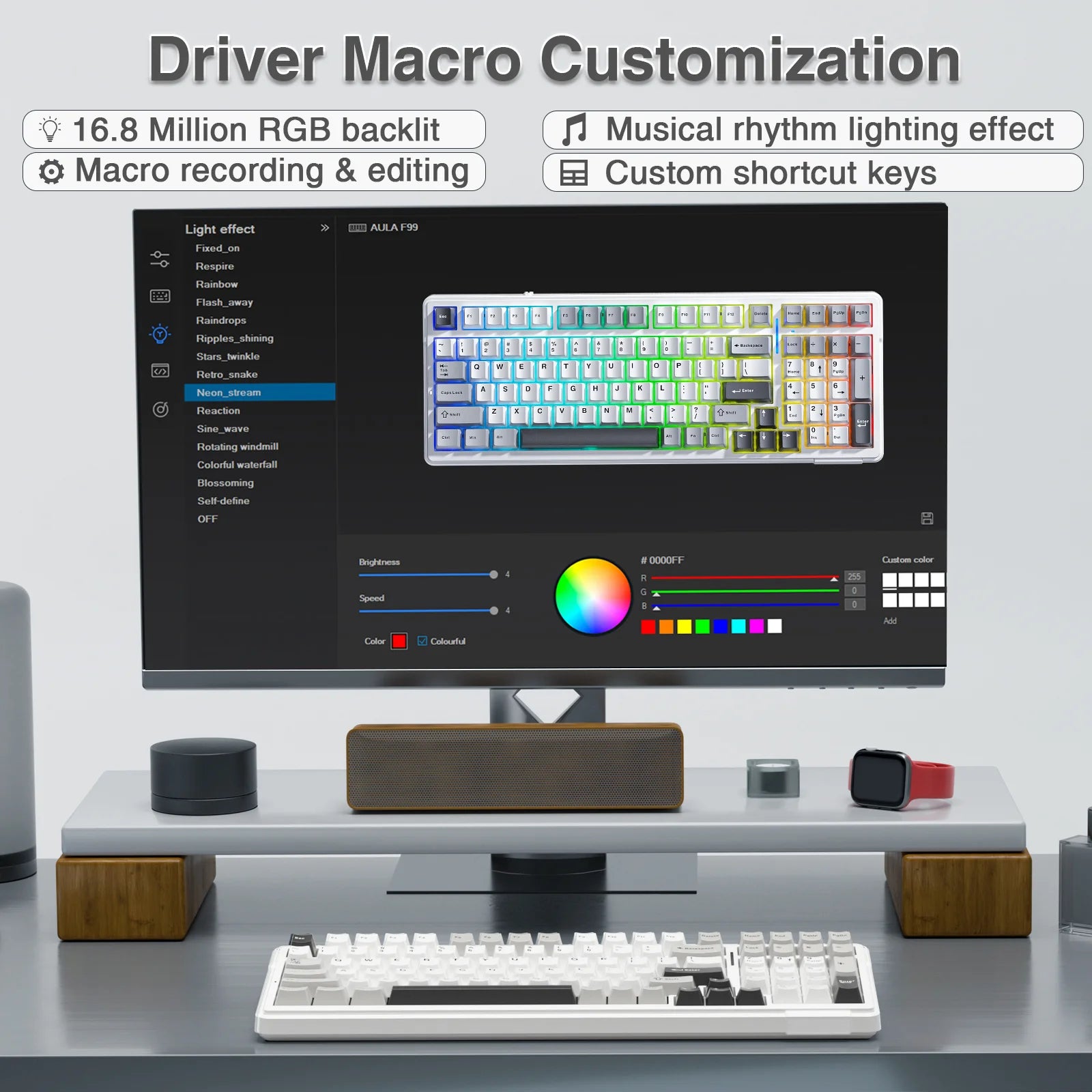 AULA F99 has multiple RGB backlit modes that you can easily switch with simple shortcuts. You can make your RGB effects with the included software. With the software, all kinds of keyboard key functions could be set, macro recorded, and personalize your function keys as you wish. The onboard flash memory unit could save the configuration to the keyboard if offline.