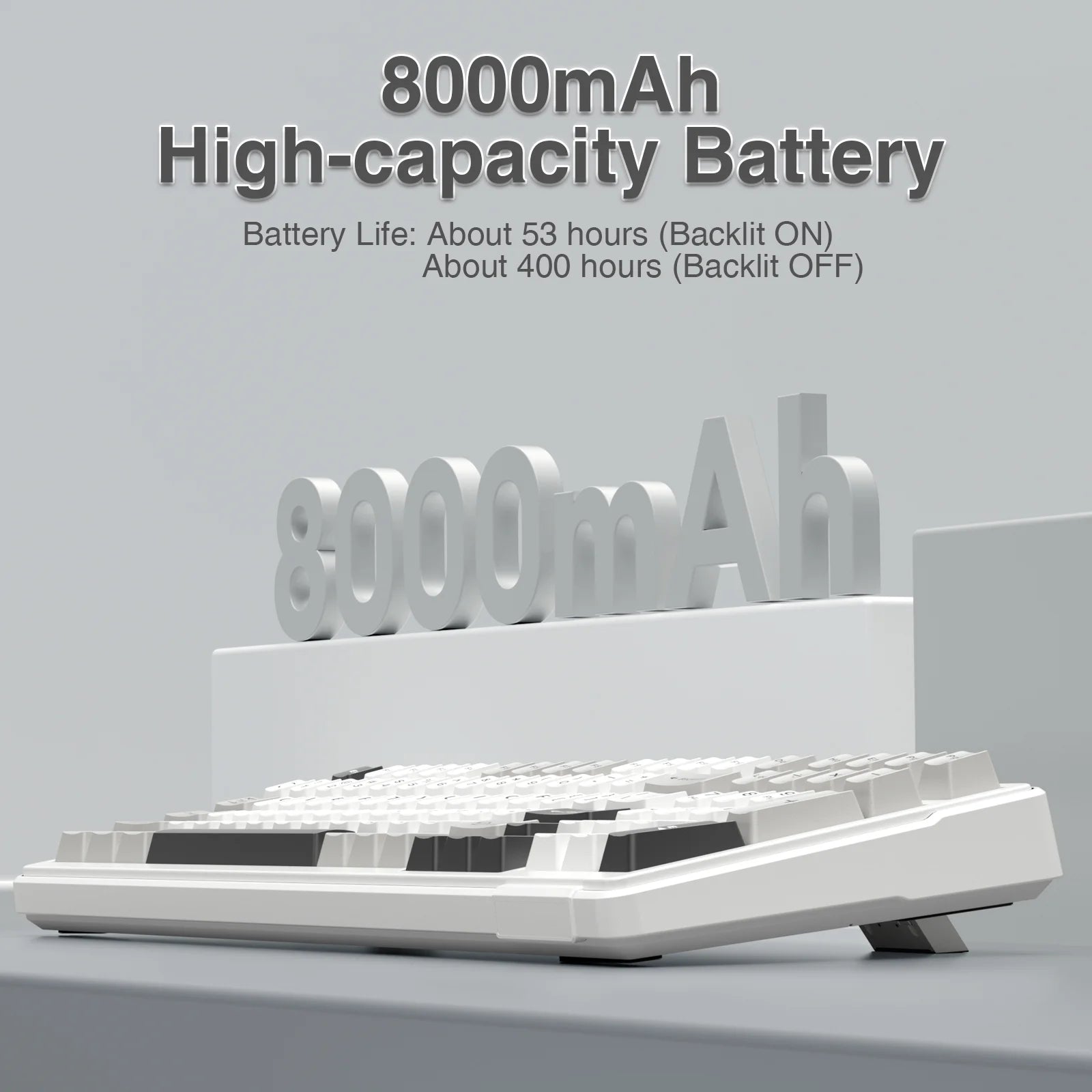 AULA F99 equipped with built-in 8000mhA capacity lithium battery, which can be charging through the Type-C cable while using in wired mode. When fully charged, it lasts 53 hours with the lights on, and about 400 hours with the light off.