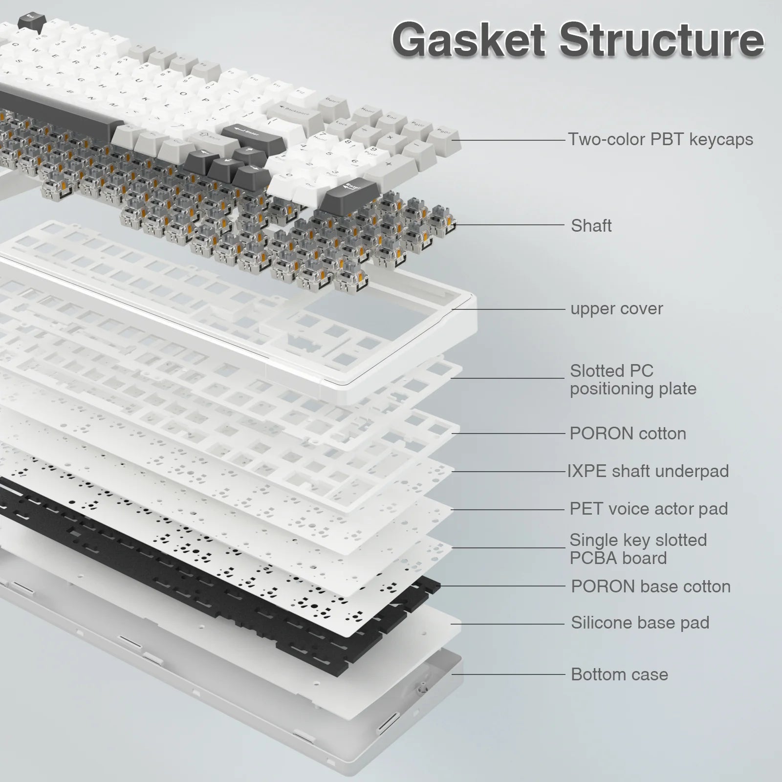 F99 is a high-end gasket-mounted keyboard with a PC plate. The keyboard also has a 5-layers premium silicone pads and noise reduction cotton to reduce 95% hollow noise,abosord typing noise,and enhance the unique soft and comfortable rebound of the Gasket structure.