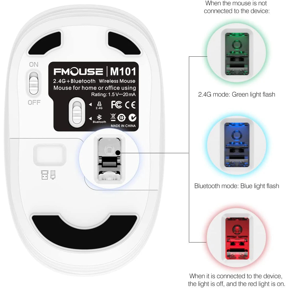 Dual mode wireless mouse realizes free switches between two devices with one mouse only by simply toggle switching.It can connecting one device through Bluetooth and the other through 2.4GHz USB Receiver. Note: You can't use Bluetooth mode and 2.4G mode at the same time.