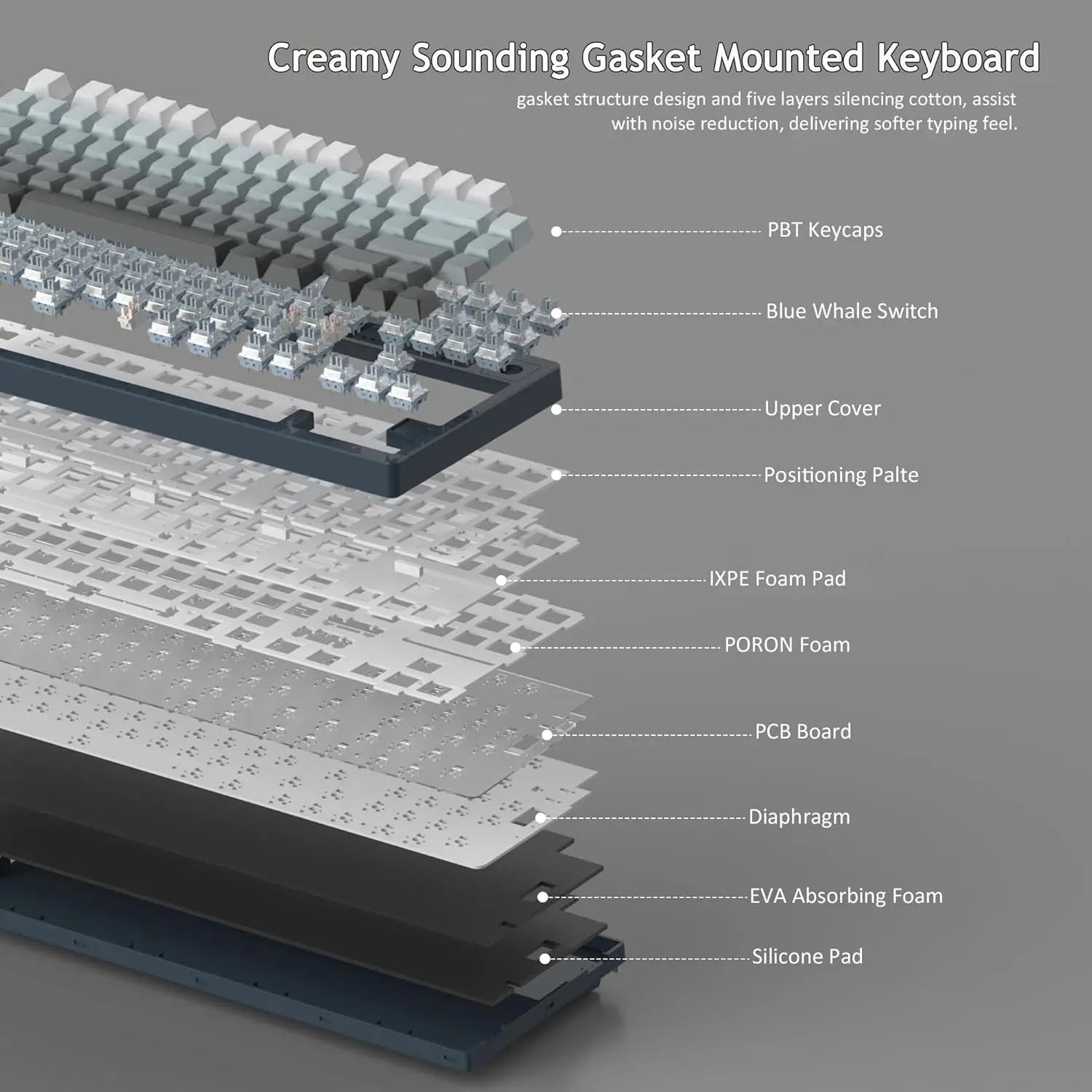 • [CREAMY THOCK SOUND GASKET STRUCTURE]: LIGHT75 keyboard mounting is different from the traditional screw fixing method, but using gaskets mounted on the top and bottom sides between the panel and the keyboard shell, which acts as a cushioning layer, in addition, the keyboard is designed with five layers sound-absorbing foams filling, can effectively reduces the noise, improves the typing comfort and accuracy, and brings crisp, clean and softer typing feel.